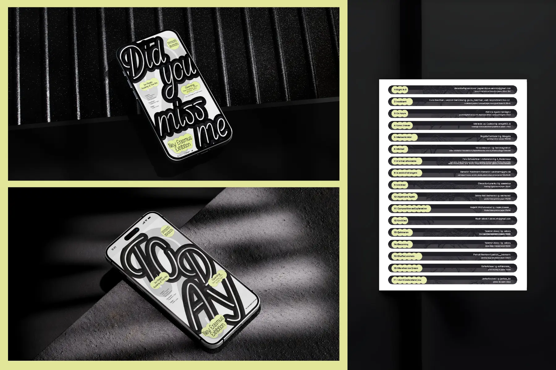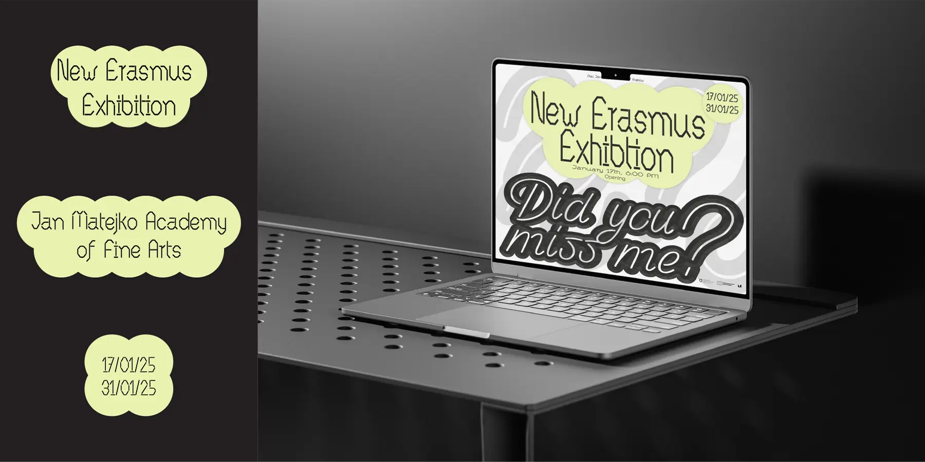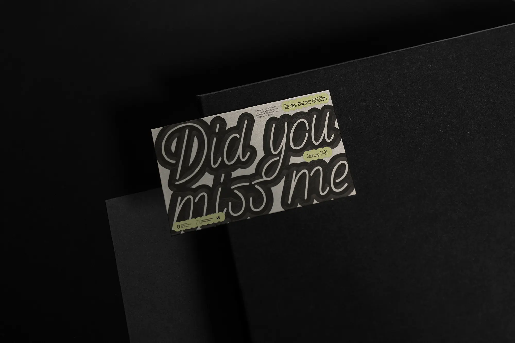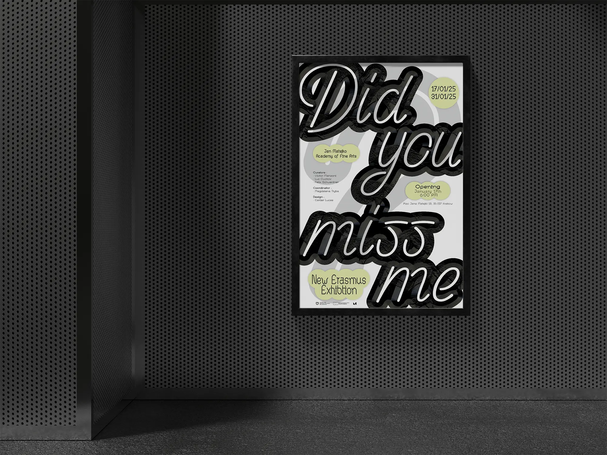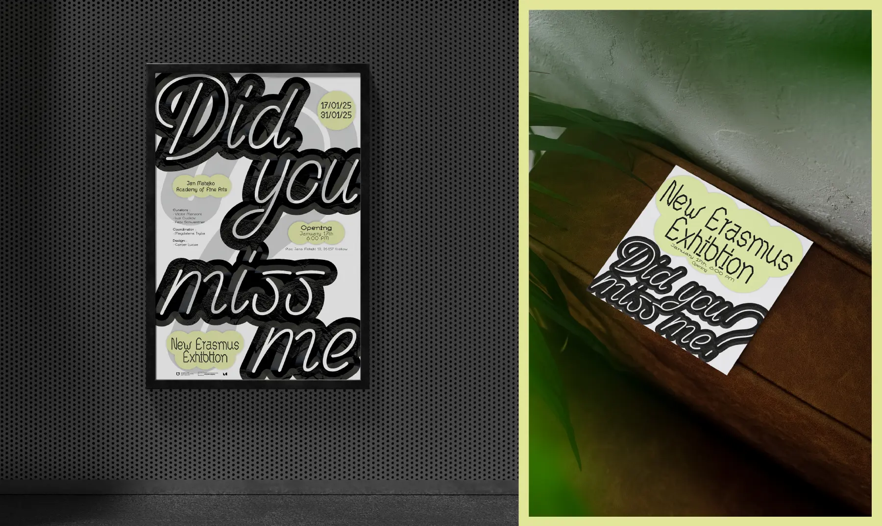 Visual identity for Did You Miss Me, an exhibition at ASP Gallery, Academy of Fine Arts Krakow. A bold typographic approach combined with rich textures, applied across all media.