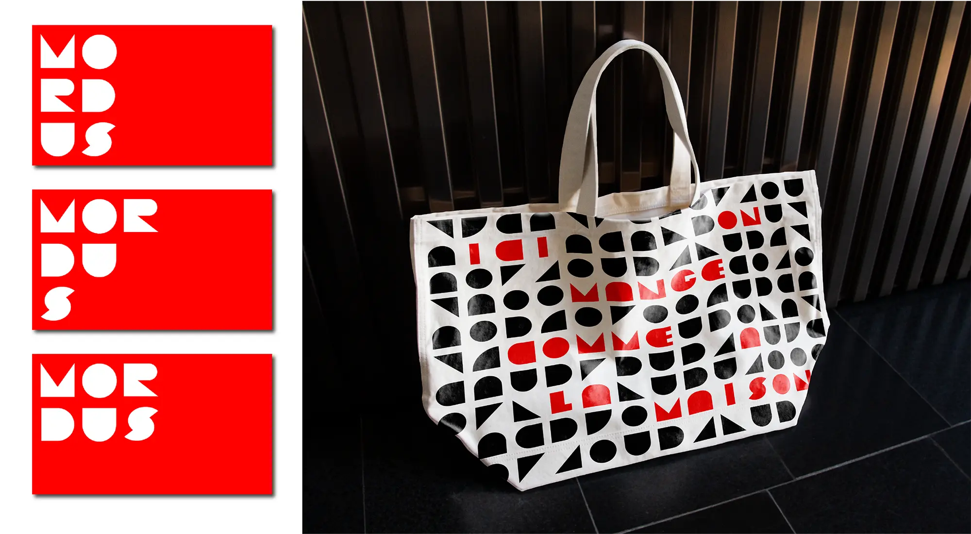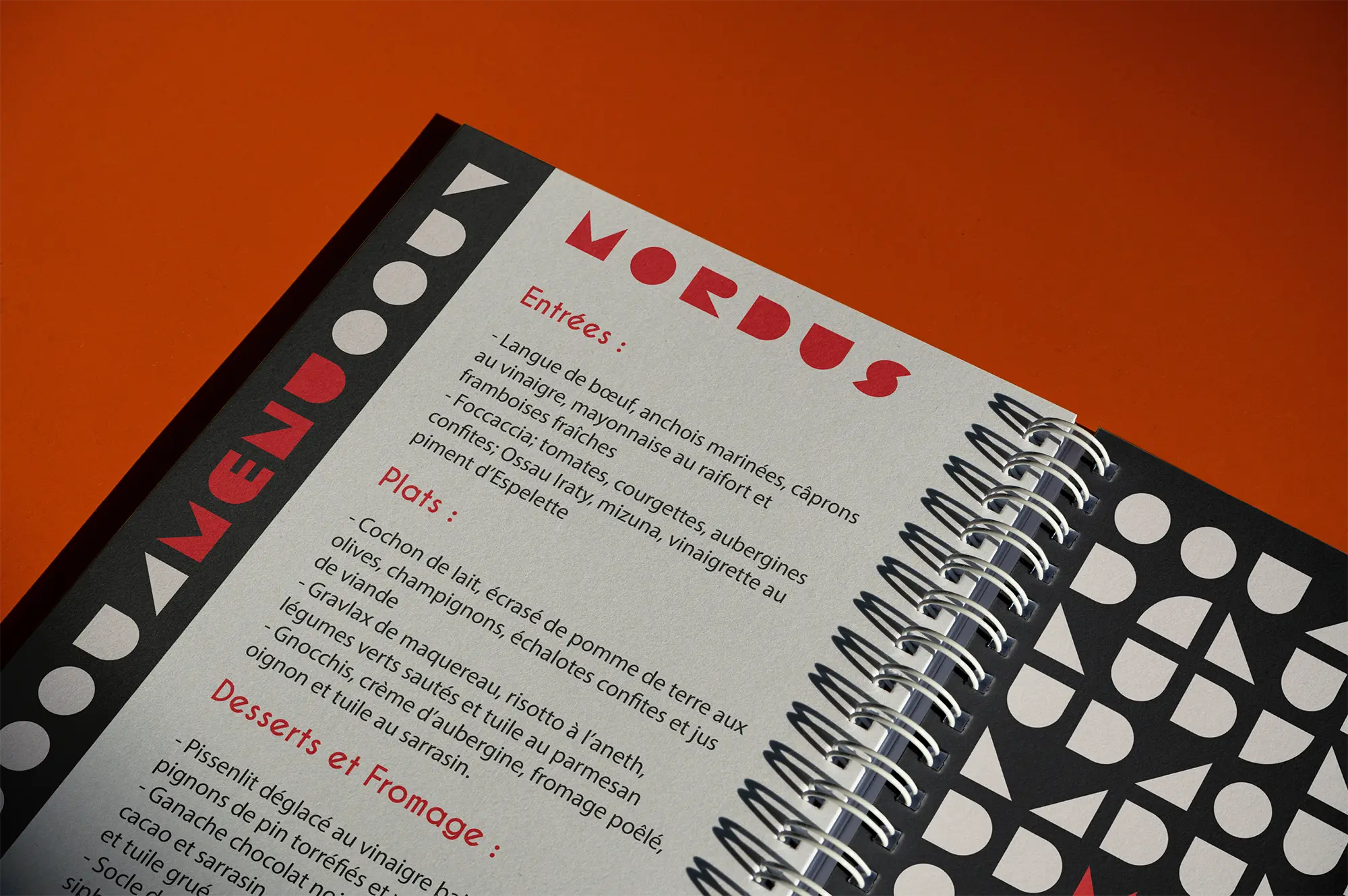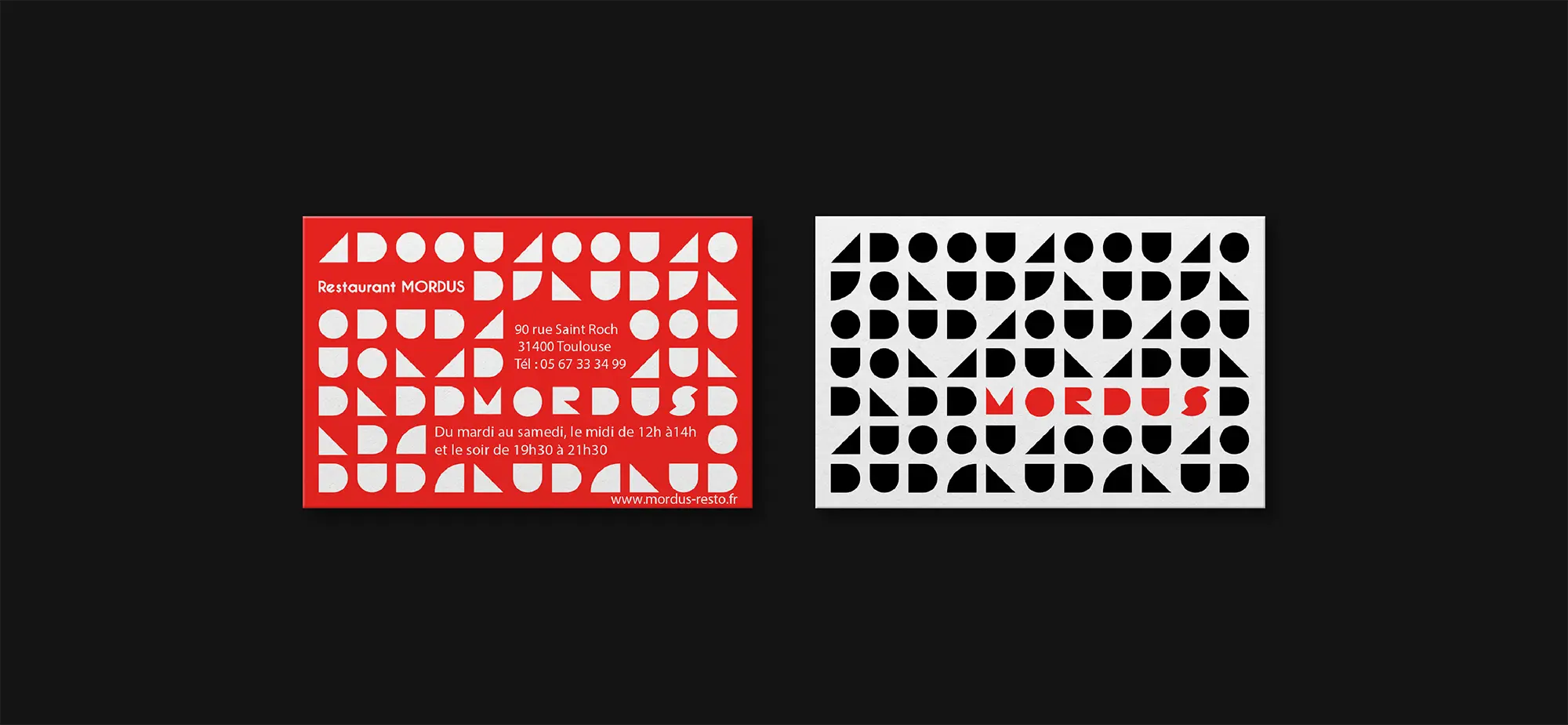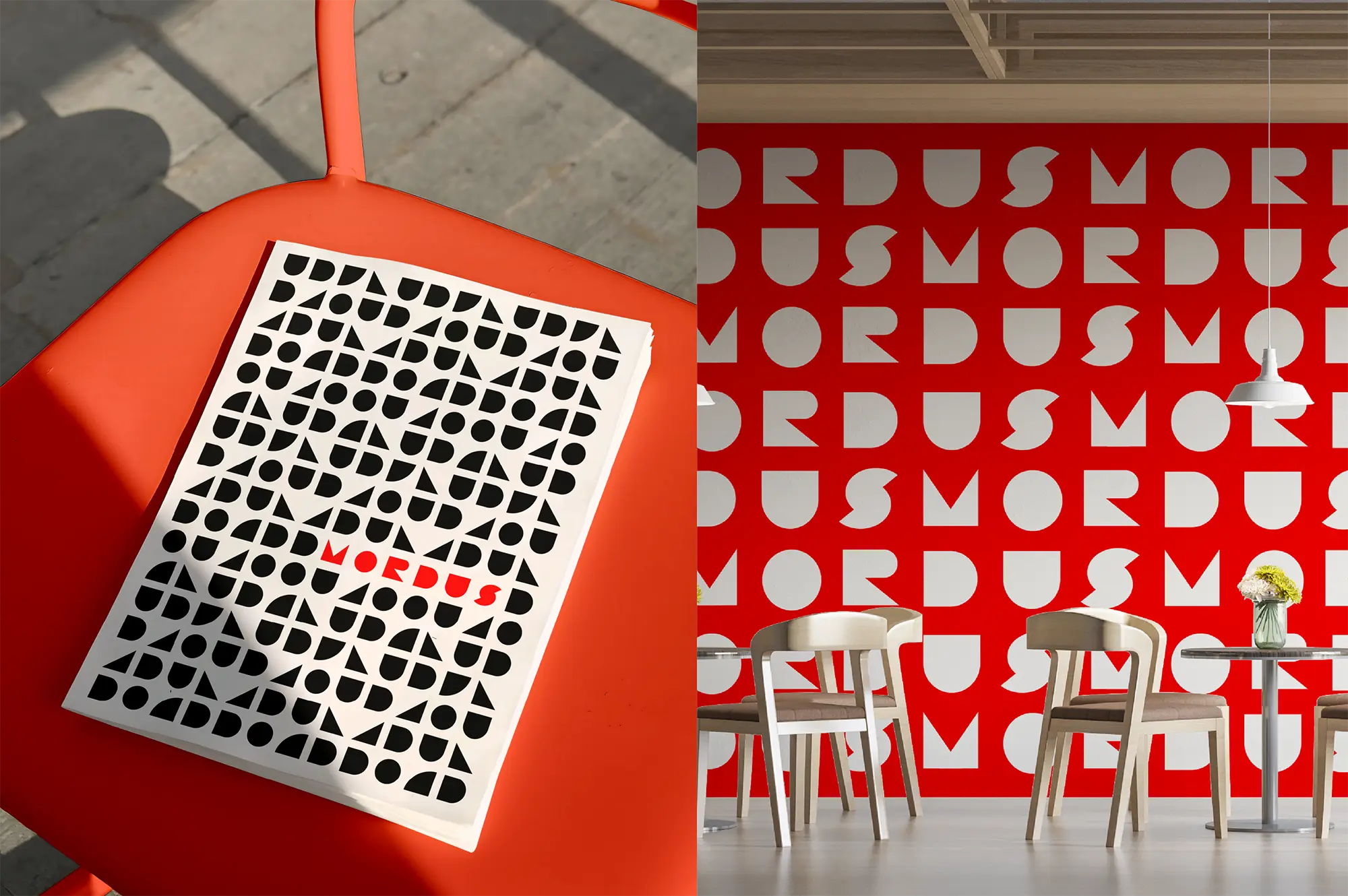 Created the visual identity for Mordus restaurant, focusing on simplicity and tradition through geometric forms and a custom typographic logo. The branding combines red and black to reflect both the intensity of flavors and a refined dining experience.